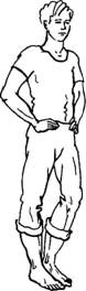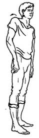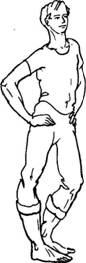 Исходное положение: стоя прямо, ступни отстоят друг от друга на расстоянии нескольких сантиметров. На счет «раз» во время короткого шумного вдоха носом слегка присесть и повернуть ступни носками внутрь (пятки при этом расходятся). Затем на пассивном выдохе ноги возвращаются в исходное положение. Вдох носом делается одновременно с приседанием, выдох уходит после каждого вдоха абсолютно пассивно. Спина прямая, руки свободно висят вдоль туловища. При желании кисти рук могут делать легкие плавные произвольные движения на уровне пояса.