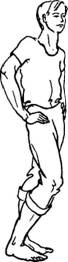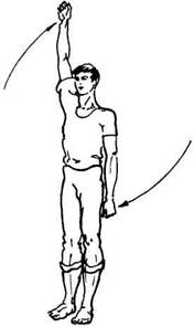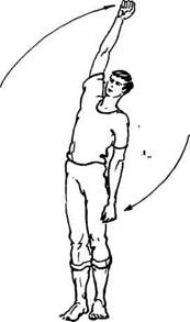 Руки в локтях не сгибать, они должны быть все время прямыми. Рука, поднятая до отказа вверх, может слегка касаться уха, а та, которая опущена вниз,— слегка прижиматься к бедру.