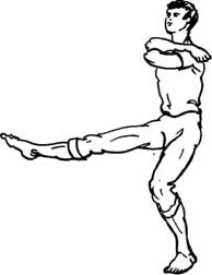 В момент маха нужно слегка присесть на опорной ноге и снова выпрямиться. Должно получиться легкое танцующее приседание, как в упражнении «Кошка?» из основного комплекса нашей гимнастики. Норма—12 раз по 8 вдохов-движений, а при хорошей тренировке — 3 раза по 32 вдоха-движения.